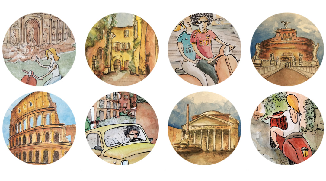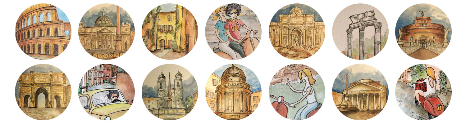 Illustrazioni d’autore ispirate a Roma, alle sue architetture, ai suoi quartieri e alla vita quotidiana della città.